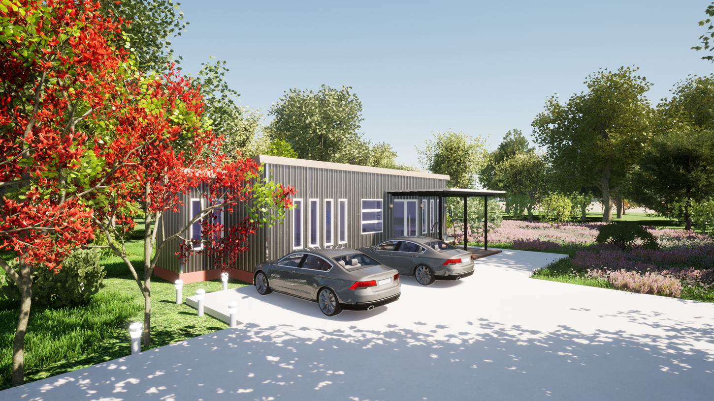 Although a container may give a more industrial feeling, this is offset by the wooden features of the front porch and the large narrow windows that break up the look of the container's exterior and allow lots of light to enter the spaces, making it feel and look bigger. This minimal 2 bedroom container design presents an affordable alternative to traditional housing construction.